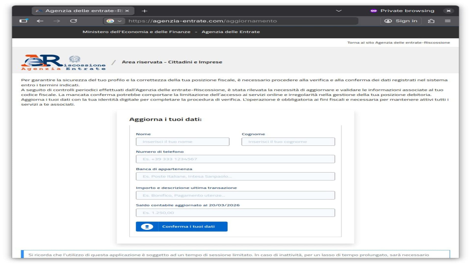 Ulteriori elementi quali loghi, font di ottima fattura e la richiesta di conferma di essere un utente reale aumentano la percezione di affidabilità. Il passo successivo consiste nell’inserimento dei dati sensibili nell'apposita pagina (vedi immagine). Il bottone “Conferma i tuoi dati” conclude l’attacco inviando i valori inseriti direttamente ai malfattori.